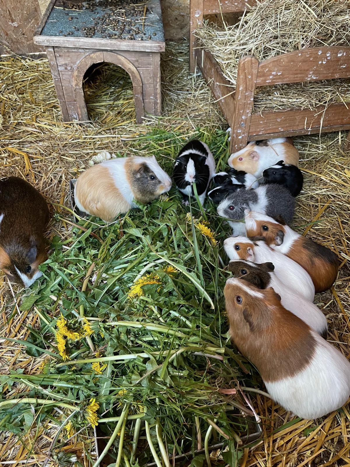 In unserer Nager Villa wohnen viele flauschige Meerschweinchen – und das auf gleich 3 Etagen! Sie flitzen flink von Stockwerk zu Stockwerk, kuscheln sich zu kleinen Gruppen zusammen und genießen die warmen Sonnenstrahlen im großen Außengehege. Am allerliebsten mögen sie frisch gepflückten Löwenzahn, den sie mit großem Appetit knabbern. So viele Meerschweinchen sind es, dass man sie gar nicht so leicht alle zählen kann – da hilft nur genaues Hinschauen und ganz viel Geduld! Komm vorbei und entdecke die kleinen Nager und ihre spannende Villa – hier gibt’s immer was zu staunen und zu knuddeln!